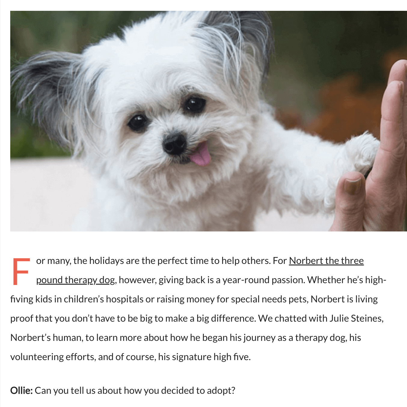Ollie is an animal wellness brand that makes human-grade dog food. I wrote humor listicles and led interviews with Instagram famous pup parents. My articles gained thousands of views and led to an increase in 15% traffic on Ollie’s site.
